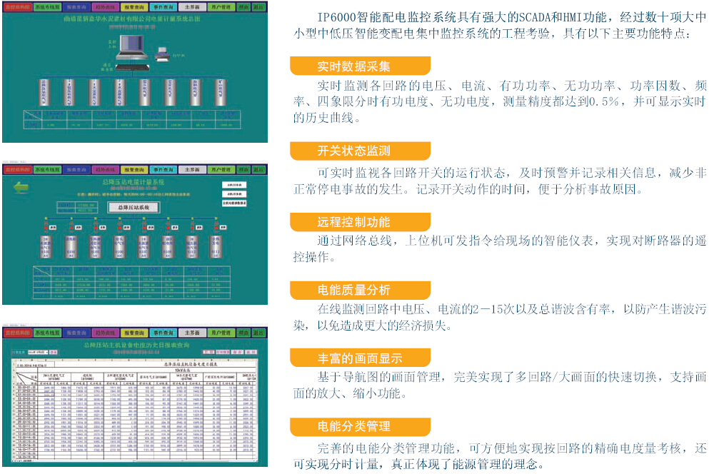 IP6000能源管理系統(tǒng)就是采用先進(jìn)的計(jì)算機(jī)技術(shù)、網(wǎng)絡(luò)通訊技術(shù)、控制技術(shù)和軟件技術(shù),專門針對中低壓用戶開發(fā)的配電監(jiān)控、分析和管理信息系統(tǒng),是一種開放式、單元化、可擴(kuò)展的變配電綜合電力自動化系統(tǒng)。該系統(tǒng)由開關(guān)配以具有通信功能的6000系列數(shù)字電力儀表,經(jīng)數(shù)字通信與計(jì)算機(jī)系統(tǒng)網(wǎng)絡(luò)連接,即可實(shí)現(xiàn)配電設(shè)備運(yùn)行管理的自動化、智能化。完成數(shù)據(jù)的實(shí)時(shí)采集、數(shù)字通信、遠(yuǎn)程操作與程序控制、保護(hù)定值管理、事件記錄與告警、故障分析、各類報(bào)表及設(shè)備維護(hù)信息管理等功能。
