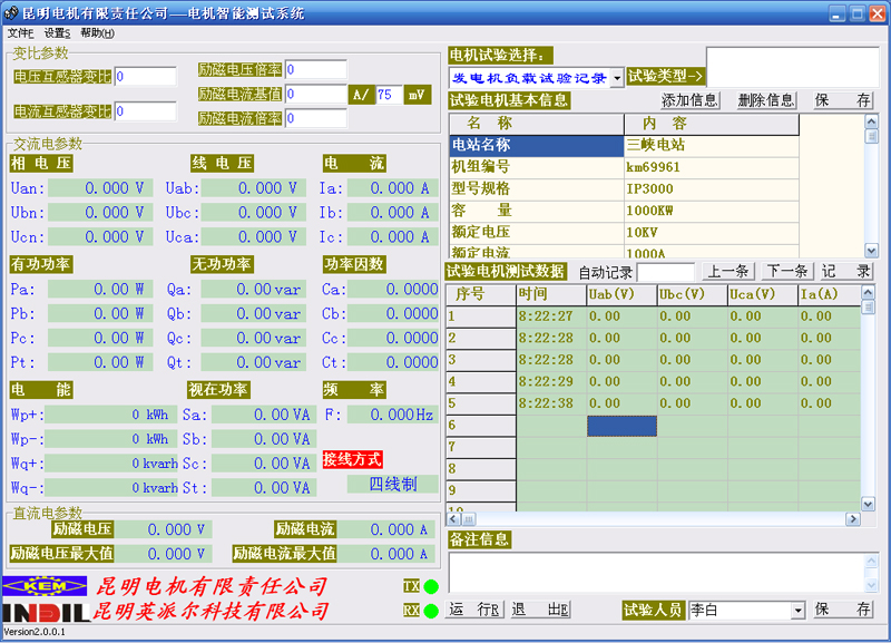 電機智能測試系統(tǒng)適用于與我公司生產的6000系列儀表通訊測試使用并生產固定格式的報表。用于記錄電機相電壓、線電壓、電流、有功功率、無功功率、功率因數(shù)、電能、視在功率、頻率等交流參數(shù)和勵磁電壓、勵磁電流、勵磁電壓最大值、勵磁電流最大值等直流參數(shù)。具有在線修改參數(shù)、全參數(shù)實時顯示功能、靈活的實驗電機基本信息編輯功能、自動記錄數(shù)據(jù)功能、串口通信、監(jiān)視各臺從機等特點。