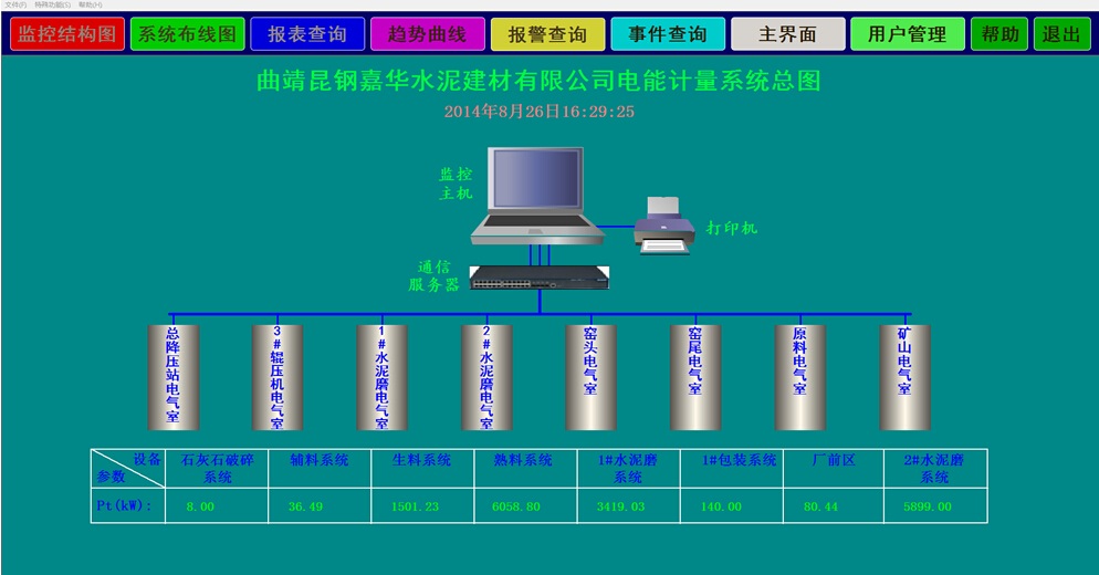 1、電能計量以各道工序為主體,基本分為:總降壓站、礦山、生料、窯、煤磨、1#水泥磨、2#水泥磨、包裝、原料、供輔(空壓機和水處理)、化驗室(包括中控室)及生活區共12個計量單元;