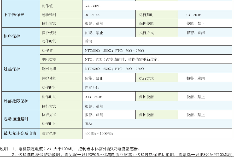 控制器提供了多種保護方式:過載保護、堵轉保護、欠載保護、欠功率保護、相序保護、缺相/不平衡保護、接地保護、漏電保護、欠電壓保護、過電壓保護、過熱保護外部故障保護(工藝聯鎖保護)、起動加速超時保護、最大允許分段電流。